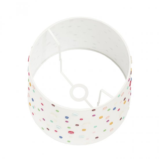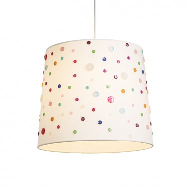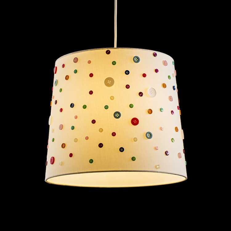 Toto dekorativní stínidlo ozdobené barevnými knoflíky je vhodné pro zavěšení nebo na stojanové podstavce.